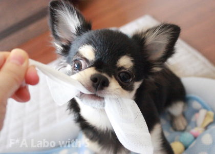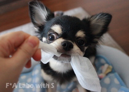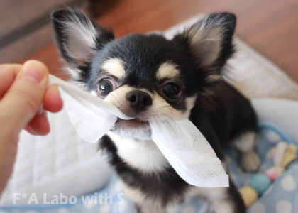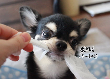 颯ちゃんが咥えているのはティッシュではなく歯磨きシート。