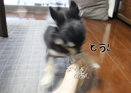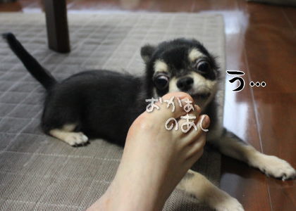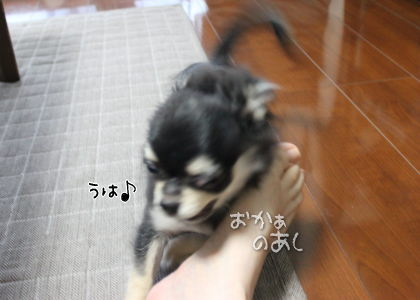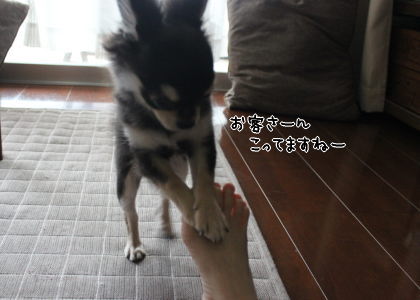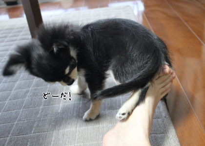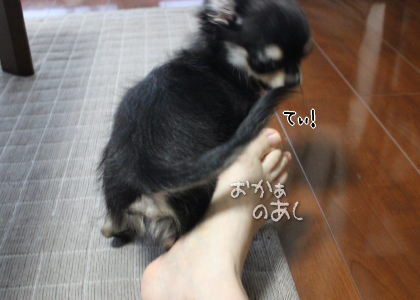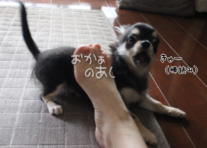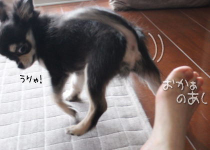 颯天が、おかぁの足にアタックしているひとコマなのです。